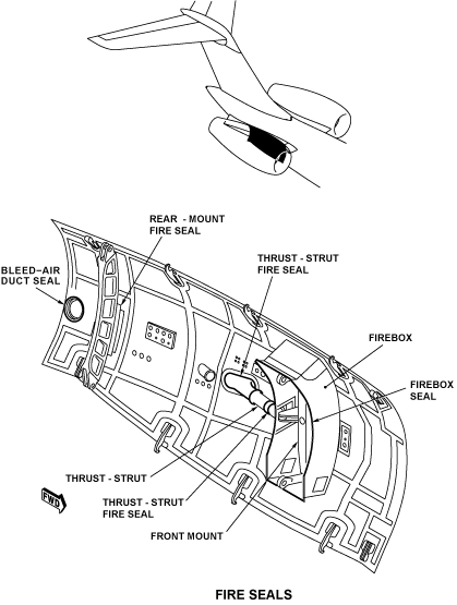 There are two thrust-strut fire seals. One gives protection at the elliptical opening where the thrust strut goes through the fixed cowl. The seal attaches with bolts to the fixed cowl and with a clamp to the thrust strut. The other is at the rear of the firebox, where there is an opening for the thrust strut. A circular duct with a square flange attaches to the firebox. The thrust strut goes through the circular duct and into the firebox. The seal attaches with clamps around the thrust strut and the circular duct.