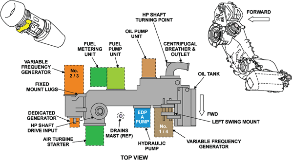 The accessory drives system, through the accessory gearbox, transmits power from the air starter to the HP compressor during normal start procedures. It also has a connection to turn the engine by hand during maintenance operations.