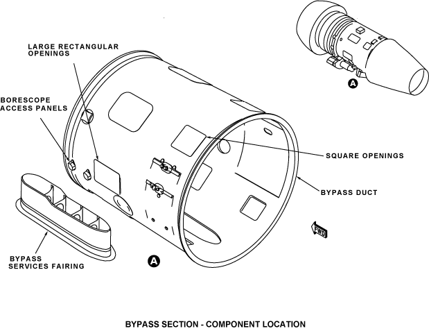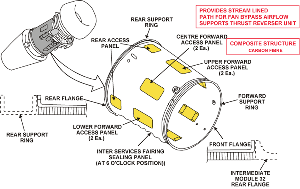 The bypass duct is made of composite material honeycomb and skin sections with holes bonded together. At the front end (smaller diameter), it attaches to the intermediate case and at the rear end to the rear mount ring. It has six large rectangular openings, three on each side of the engine which give access to most of the components that are on the core and three smaller square openings which give access to the inter-turbine temperature (ITT) thermocouples. All nine openings are made stronger at the edges with laminates and C-section stiffeners and are sealed with access panels. Near the horizontal center line at the front, there are two small openings which give access to borescope bosses. These also are sealed with panels.