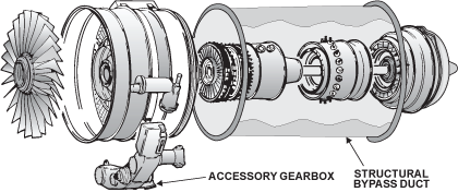 The bypass section is a space around the engine which takes the bypass air from the inlet to the rear of the engine and out into the atmosphere. The air flows between the core engine fairings and the bypass duct. The bypass duct is a structural engine component which makes a smooth annular duct for the bypass airflow. Fairings installed on the core engine also help to make the airflow smooth. The inner surface of the bypass section is the core engine fairings and the outer surface is the bypass duct.