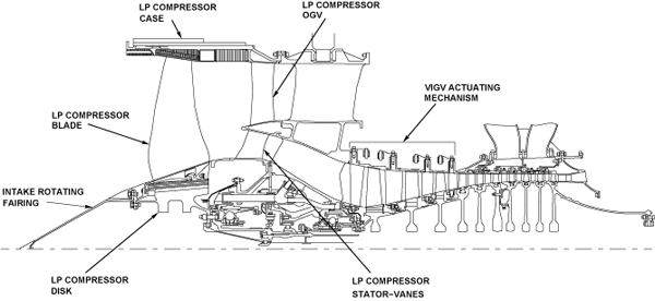 The LP compressor stator-vanes control the flow of air into the bypass duct and the core of the engine. The LP compressor stator-vanes assembly is divided into two sections, the LP-compressor outlet guide-vanes (OGV) and the LP-compressor engine stator-vanes.