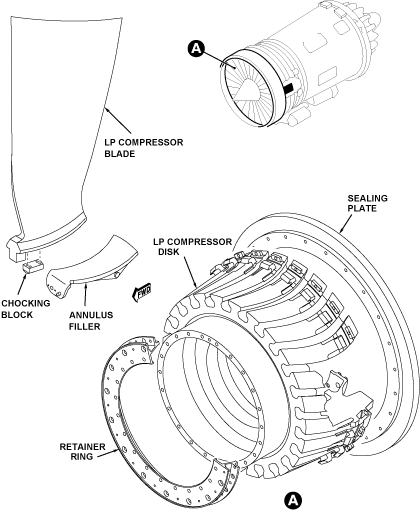 The LP compressor module has one stage, wide-chord blades, annulus fillers and a disk. The blades and fillers stay in position with a retaining ring and a sealing plate. The retaining ring, which attaches to the front of the disk, also holds the intake rotating fairing. The sealing plate attaches to the rear of the disk. Bolts (and balance weights) safety the ring and the plate to the disk.