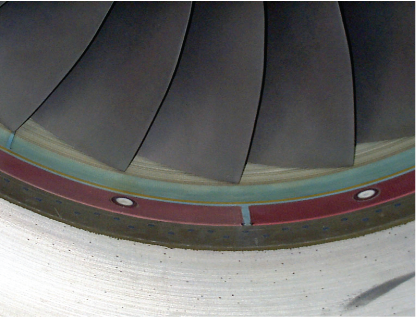 There are 24 annulus fillers between the blades to give a smooth flow of air along the disk. A rubber seal is bonded to each side of the fillers to prevent leakage of air. Pivot pins on the bottom of the fillers engage lugs on the disk. Bolts and location pins safety the fillers to the retaining ring on the front of the disk.