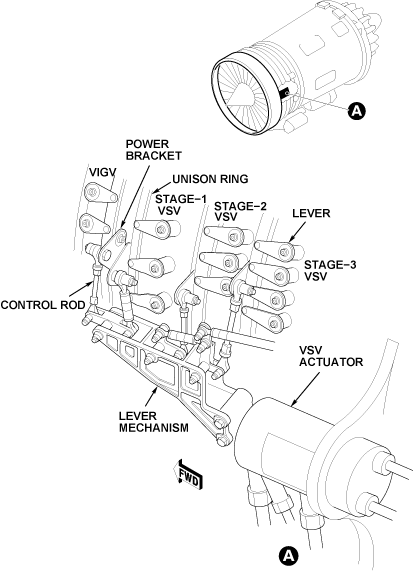 Each stage of VIGVs and VSVs has a unison ring. A mechanism of levers connects the actuator to four control rods. A power bracket connects each control rod to one of the unison rings. A set of levers for each stage connects the unison rings to the vanes. The levers attach to the top of the vanes. Pins on the levers go into bushings that are in the unison rings.