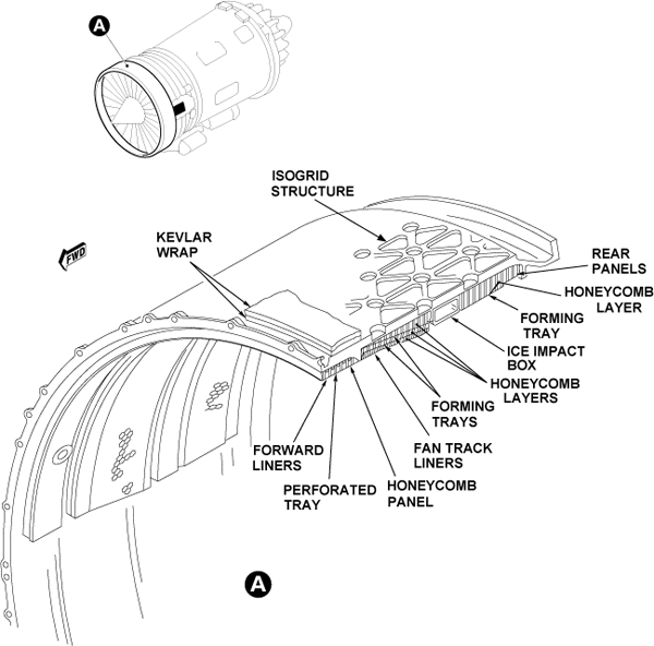 The LP compressor case has an isogrid structure. On the external surface there are three layers of Kevlar, which will contain the compressor blades if the compressor fails. A shield assembly is at the bottom of the LP compressor case to protect it from the starter-motor exhaust gases. The forward liners, fan-track liners, ice-impact boxes and the rear panels attach to the internal surface. The rear of the LP compressor case attaches to the front of the intermediate case.