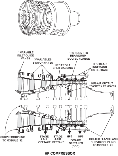 The HP compressor comprises 10 compressor stages contained on two rotating drum assemblies, which are joined between stages 6 and 7. The rear drum assembly also features the HP compressor shaft, which bolts onto the HP turbine module via a "curvic" coupling; attachment to the intermediate module is also via a curvic coupling.