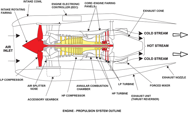 The engine is a high bypass ratio turbo-fan with low pressure (LP) and high pressure (HP) compressors. The compressors are connected to turbines through co-axial shafts. As the LP compressor turns, it pulls air into the engine and compresses it. This air then divides into two flows, the bypass (cold) flow and the core (hot) flow. The bypass air goes through the LP compressor outlet guide vanes (OGVs) and bypass duct to the exhaust nozzle. The HP compressor increases the pressure of the core air which then goes into the combustion chamber.