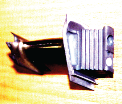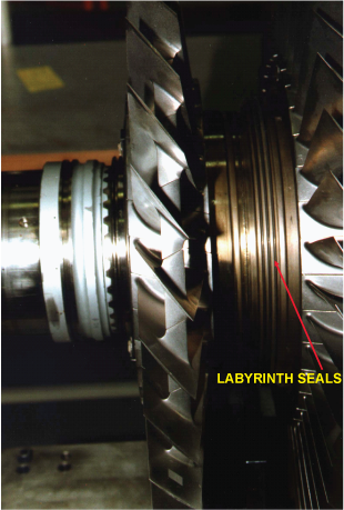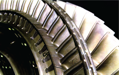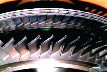 There are 100 stage-1 and 59 sets of two-piece stage-2 blades. Firtree roots attach the blades to the disks. There are 100 damper plates between the stage-1 blade roots and the disk. There are 118 damper pins in the roots of the stage-1 blades. Twenty-four retainer plates and four lock plates safety the stage-1 blades to the stage-1 disk. Thirty retainer plates and three lock plates safety the stage-2 blades to the stage-2 disk.