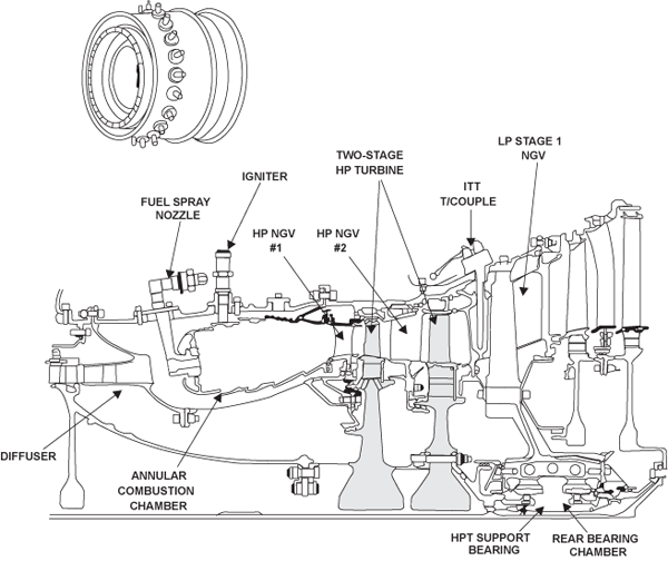 The turbine section has a two-stage HP turbine and a two-stage LP turbine. The two-stage HP turbine connects to the HP compressor drum through a curvic coupling. The stage-1 and stage-2 HP nozzle guide vanes (NGVs) are installed on the HP turbine case. The two-stage LP turbine is on the LP shaft which connects to the LP compressor. The case contains the two-stage rotor, stubshaft, LP turbine shaft and fuel shut-off mechanism. The exhaust case attaches to the rear flange of the turbine case. The rear support mount of the engine goes around the exhaust case. The turbine exhaust support-struts attach the exhaust case to the engine rear support-mount.