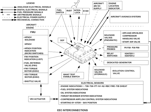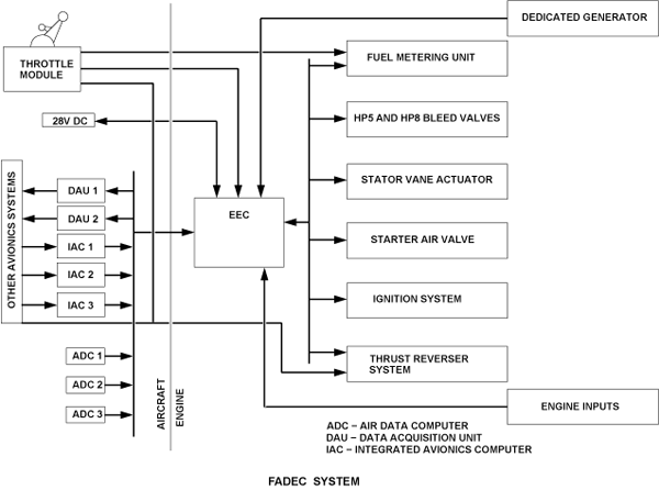 At the heart of the FADEC system is the electronic engine controller (EEC) which interfaces with the applicable aircraft systems to perform the following functions: