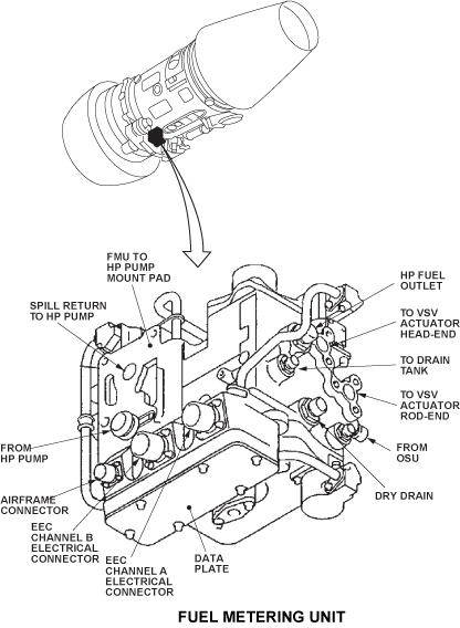 The FMU is on the fuel pump unit and meters the fuel required by the engine in response to the Electronic Engine Controller (EEC). The FMU also provides servo pressure that is used as the motive forces for the Variable Stator Vane (VSV) Actuator. The manufacturer sets a minimum fuel flow in the FMU, and this is always a higher flow than is necessary.