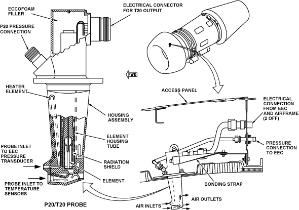The EEC measures the inlet total pressure (P20), and temperature (T20), which come independently from the P20/T20 probe. The P20/T20 probe attaches on the inner skin of the intake barrel at the top dead center (TDC) with nuts and bolts. Access to the probe is through a panel in the top surface of the nose cowl. The routing of two electrical harnesses and the P20 tube is through the rear bulkhead of the nose cowl. From this bulkhead, the P20 tube goes to the P20 connector on the EEC. The electrical harnesses connect to other related electrical harnesses, one to the EEC and the other to the engine/airframe interface.
