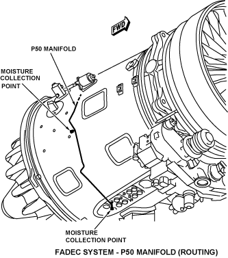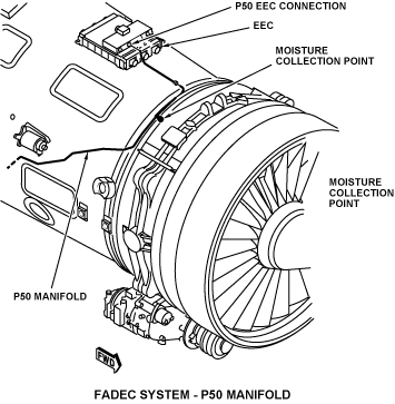 The routing of the air tube is through the services fairing tray and up the right side of the bypass duct. It connects to the pressure transducer module on the EEC. There is a water trap in the P50 tube to make sure water does not collect in the transducer. The P50 air is measured by a vibrating cylinder pressure transducer and compared to P20 inlet pressure. The EEC compares the ratio between P50 and P20 and calculates the engine pressure ratio (EPR).