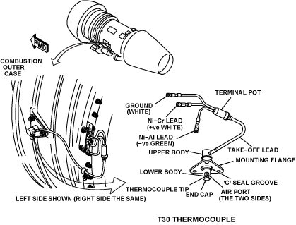There are two T30 thermocouples installed through the combustion case, one at each side on the engine horizontal center-line. They each have a triangular flange which attaches to the case with bolts. A metal C-type seal prevents air leakage and a decrease of engine pressure. The thermocouples have two elements, one made of nickel-aluminum and the other of nickel-chromium. The elements are in a short probe which is open to air temperature. Each thermocouple connects to a different channel of the EEC.