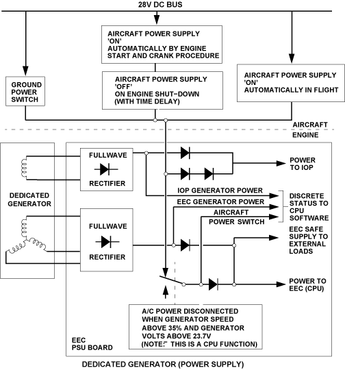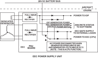 Each channel of the EEC also has a power supply unit (PSU) and an independent overspeed protection (IOP) unit. The EEC is normally powered by its own Dedicated Generator (DG) when the engine is running. When the engine is not running, the 28 VDC BATT BUS powers the FADEC.