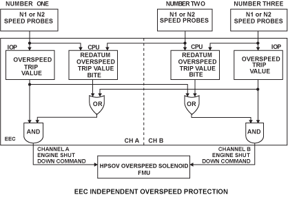 The independent overspeed protection (IOP) is a safety function to stop the engine if the compressor speed goes out of limits. The IOP unit of each channel continuously monitors the speed of the LP and HP compressors. Probes, which measure the speed of each compressor shaft, send speed signals. The EEC includes a device which prevents compressor overspeed in usual conditions of operation.