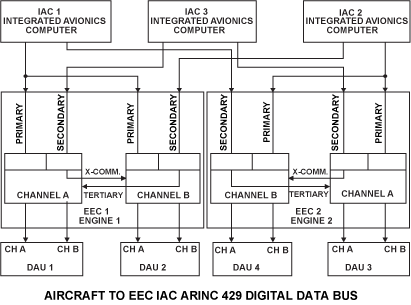 The EEC receives ARINC 429 digital data directly from the three Air Data Computers (ADC), and the three Integrated Avionics Computers (IAC).