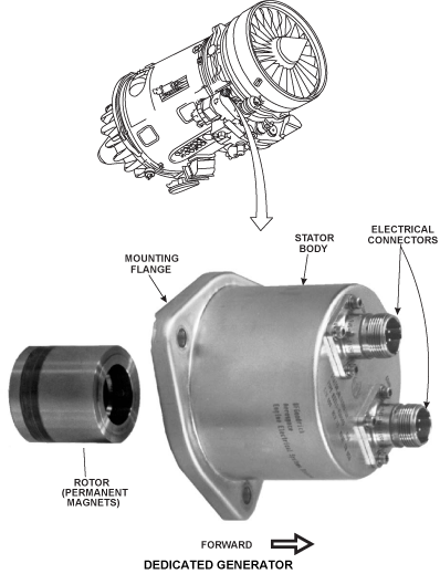 The dedicated generator is an electro-magnetic device which changes mechanical energy to electrical energy and supplies electrical power to the EEC. It has a stator housing which is on the front face of the accessory gearbox, on the right side. The accessory gearbox turns a permanent magnet rotor, which turns in the stator housing and causes electrical power. The stator housing has four sets of windings, two for each channel of the EEC. Electrical power goes to the EEC through harnesses which connect to receptacles on the end face of the stator housing.