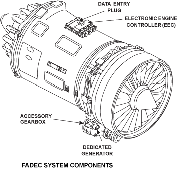 The FADEC system has units and sub-systems which together have full control of the engine operation. The system includes electronic and mechanical units and uses air, fuel and electrical sub-system data for control functions. These are supplied as electrical signals which are sent to the computers. A continuous analysis of the data compares the inputs with engine/system performance and automatically adjusts the fuel flow or air flow as necessary. During usual engine operation, a dedicated generator energizes the FADEC system.