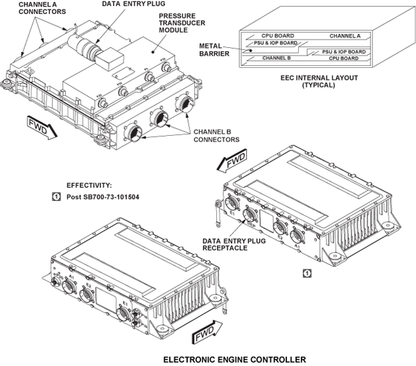 The EEC is an electronic control unit containing two channels, A and B. Each channel consists of a central processor unit (CPU), power supply unit (PSU) and an independent overspeed protection (IOP) unit mounted on application-specific integrated circuit (ASIC) boards. Internal hardware features provide fire protection between the two channels. Each EEC channel has three external electrical recepticles mounted on connector modules. The front three are part of channel B. The rear three are part of channel A. The electrical inputs and outputs go to and from channels A and B through these receptacles.