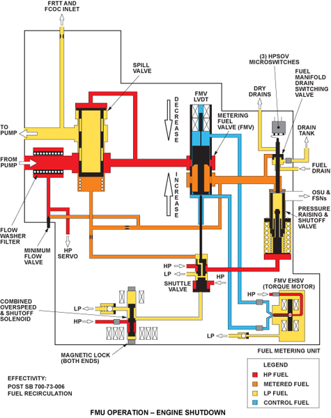 Fuel is bled off before the minimum flow valve as servo pressure and goes through internal holes in the unit. This HP servo pressure opens or closes valves in the FMU as a function of the unit.