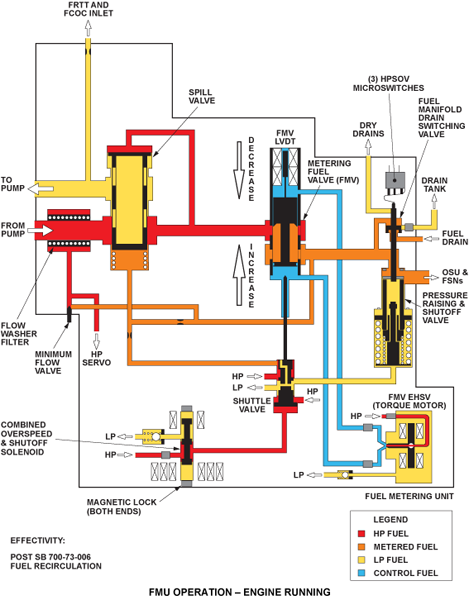 The spill valve senses FMV upstream pressure at its head which is balanced by a combination of a spring and FMV downstream pressure. The position of the FMV is controlled by its EHSV/Electro-Hydraulic Servo Valve, and its position is fed back to the EEC by the FMVs LVDT (i.e. position sensor).