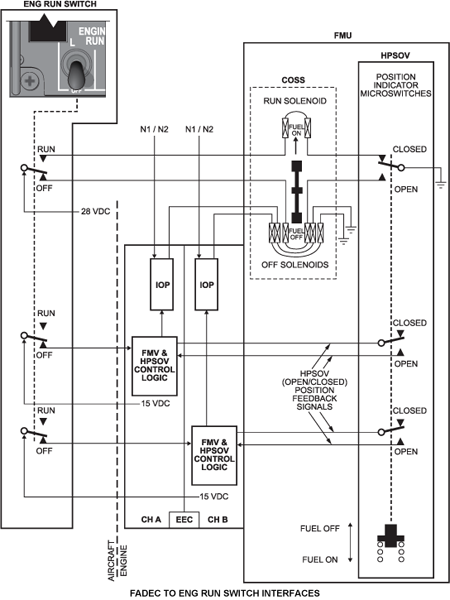 The ENG RUN switch can be manually selected by the pilot to either the OFF or RUN positions to inhibit or allow the EEC to control the engine. The ENG RUN switch interfaces with both the EEC and the HPSOV to ensure the following capabilities: