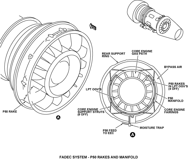 P50 is the core engine exhaust pressure. The air is bled from the rear of the LP turbine where it flows into four outlet guide vanes (OGVs). The OGVs which are at equal distances around the exhaust case, each have four small diameter tube inlets in the leading edge. These let the P50 air collect in the OGVs which are hollow. External tubes connect the outlets from the four OGVs together as a manifold, which connects to an air tube.