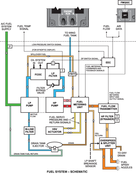 The majority of the spill flow is returned back into the HP pump inlet. A portion of this spill flow is redirected to the FRTT, as described above. With the FRTT system OFF, the excess fuel that passes from the fuel metering unit to the FRTT valve is then sent to the inlet of the fuel cooled oil cooler. With the FRTT system ON, the fuel is directed back to the aircraft wing tanks and the path to the fuel cooled oil cooler is closed.