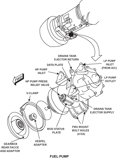 The fuel pump unit produces a supply pressure for the LP fuel system, including the motive flow for a Drains Tank Ejector/DTE. The unit also supplies HP fuel to the FMU (Fuel Metering Unit) at a sufficiently high pressure and flow rate to satisfy metered fuel flow requirements to the spray nozzles and the VSV actuator. The fuel pump unit is mounted at the center rear pad of the AGB by a V-band clamp.