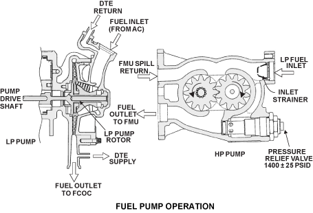 Fuel is supplied to the LP pump at a pressure of 20 psi (137.90 kPa) and goes from the pump at 150 psi (1,034.22 kPa). This keeps sufficient pressure in the adjacent system for changes in the fuel pressure and temperature across the FCOC and the LP fuel filter. A supply of pressurized fuel is also sent through the fuel drain-tank ejector valve to make a suction in the drain tank. This takes fuel from the drain tank back to the supply side of the LP pump.
