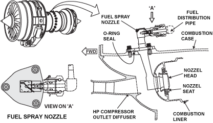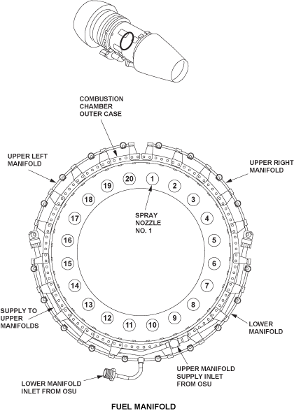 The fuel spray nozzles are numbered clockwise (as viewed from the rear), with No.1 nozzle at the 12 o'clock position. All FSNs are interchangeable. Fuel is routed from the fuel manifold to the fuel spray nozzles by individual distribution tubes.