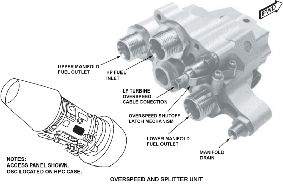 The OSU contains two valves within an aluminum housing. The spring-loaded splitter valve distributes fuel to the two manifolds, and the overspeed valve provides fuel pressure to the back of the splitter valve, closing it in the event of LP shaft breakage detection. The overspeed valve has a latching spring.