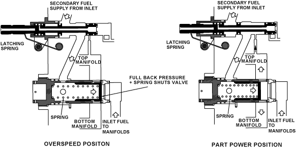 In the event of LP shaft breakage detection, the overspeed valve will open and latch, inlet fuel pressure will act on the rod side of the splitter valve. The spring and fuel pressure overcomes the inlet fuel pressure on the piston head and the valve closes.