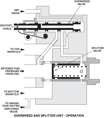 If the LP shaft becomes defective, the MSU overspeed valve is mechanically moved by the emergency shut-off cable. This movement of the overspeed valve lets a secondary fuel supply go behind the splitter valve. This secondary fuel supply increases the pressure behind the valve and closes it. This stops the fuel flow to the fuel nozzles. The valve cannot be set again until the unit is removed from the engine. When engine operation is stopped, openings in the MSU let unwanted fuel from the manifolds drain to the drain tank.