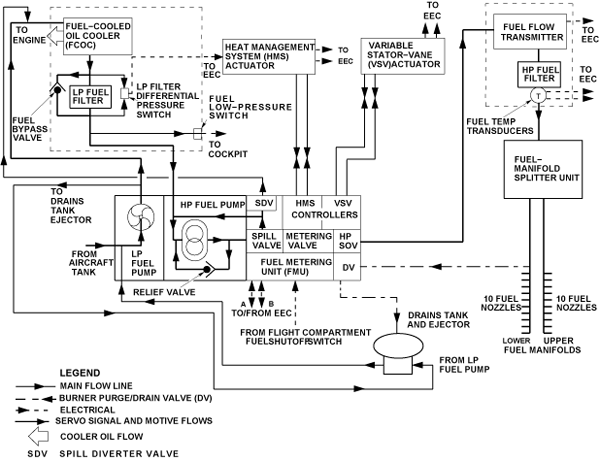 The fuel goes into the engine fuel system at the aircraft/engine interface. The low pressure (LP) fuel pump sends the fuel through the LP fuel filter, to the high pressure (HP) fuel pump. The HP fuel pump sends the fuel through the fuel metering unit (FMU) and the HP fuel filter, to the fuel-manifold splitter unit (MSU). At the MSU, the fuel is sent to the upper and lower fuel manifolds and to the 20 fuel nozzles. Fuel pressure is also necessary for the operation of specified engine units. The FMU supplies a specified quantity of fuel to give servo pressure for the function that follows: