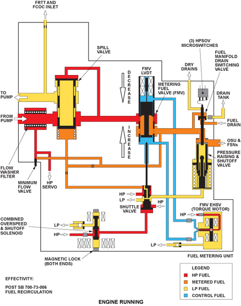 This excess fuel is a portion of the spill flow, which is circulating around the HP pump because the HP pump always delivers fuel in excess of engine requirements. This is because the pump is sized for the windmill relight case, where light-up fuel flow has to be accomplished at very low rotational speeds. This results in a significant pump over capacity at higher engine speeds.