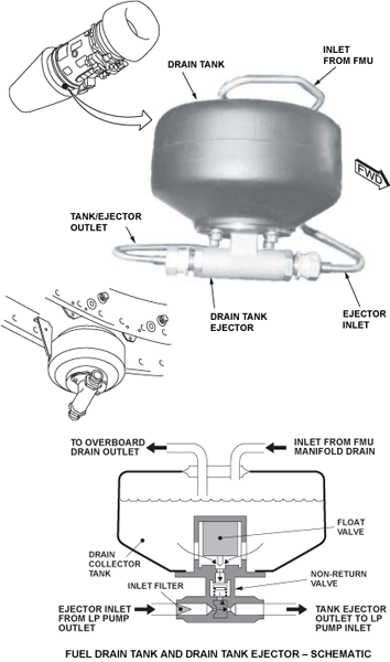 The tank capacity is sufficient for two engine shutdowns, following aborted start attempts. The tank has an integral ejector, the drain tank ejector (DTE) which uses LP pump delivery fuel as a motive force to empty the tank. The DTE has a float valve to prevent ingestion of air into the DTE return. A dry drain is fitted to the top of the tank to dump fuel overboard in the event of DTE malfunction.
