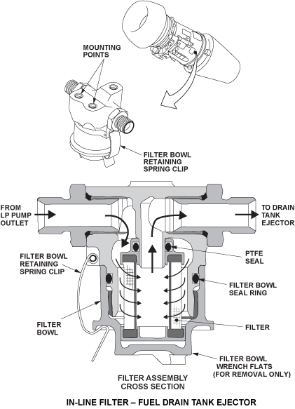The filter is situated downstream of the LP fuel pump and upstream of the drain tank ejector. Fuel from the LP fuel pump outlet passes through the filter element and then on to the drain tank ejector pump. This ensures that the fuel is clean prior to entering the ejector and does not contaminate it.
