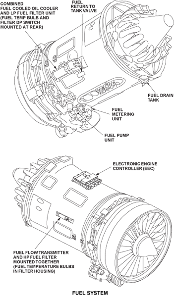 The fuel and control system supplies sufficient fuel to the combustion section for satisfactory engine operation during all ground/flight conditions. Fuel is supplied to the combustion section at a flow rate which agrees with the engine thrust set in the flight compartment. The primary function of the fuel system is to pump and meter fuel to the engine in accordance with the demands generated by the engine electronic controller (EEC). The EEC automatically keeps the thrust at the level set with the thrust levers. This is done for all changes of air temperature and pressure. Engine shaft speeds, exhaust gas temperatures (EGT) and other limits are also kept at safe values. The metering requirements fall into three main categories. The engine must be able to: