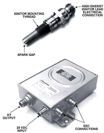 The two igniter plugs receive pulsed energy from the ignition exciter boxes via the HE leads and produce sparks to ignite the fuel/air mixture in the combustion chamber.