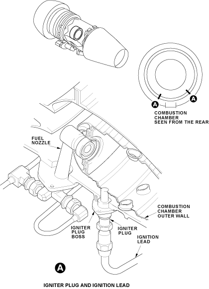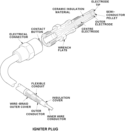 The ignition lead has an inner wire conductor and an outer conductor. The igniter leads carry the energy pulses from the ignition exciter to the igniter plug. They are routed down both sides of the bypass case to the inter services fairing and then to the core engine mounted igniter plugs.