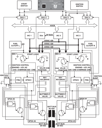 The ignition system is controlled through inputs from the EEC. It initiates ignition of the fuel/ air mixture at the optimum point during the start sequence, terminates ignition just above the self-sustaining point of the engine and maintains combustion during the critical phases of the flight (i.e. takeoff, landing and automatic relights in flight).