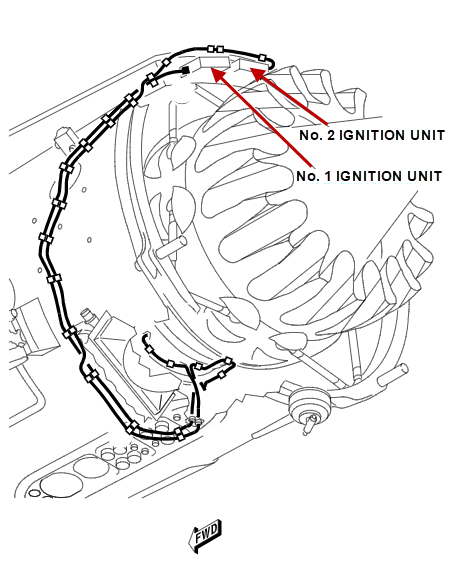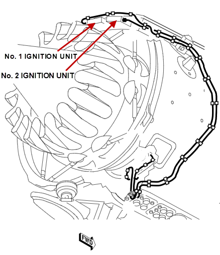 A different ignition lead connects each ignition unit to one of two igniter plugs. These igniter plugs attach to bosses on the outer combustion case, at approximately 4:30 and 7:00 o'clock position. The routing of the ignition leads is down the outboard side of the bypass duct to the interservices fairing. They then go through the inter services fairing and on to the related igniter plug. The ignition lead from ignition unit No. 1 connects to the igniter plug at the 4:30 o'clock position. The ignition lead from ignition unit No. 2 connects to the igniter plug at the 7:00 o'clock position.