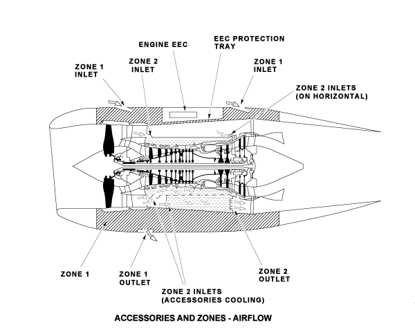 Zone 1 is the annular space below the cowls which extends axially from the air inlet cowl to the thrust reverser. The front of the zone is the air-inlet cowl rear-bulkhead and the rear is the thrust-reverser front-frame. These two components are fire resistant over the full 360 degrees. The inner surface of the zone includes the ring which holds the inlet cowl, the LP compressor case and the bypass duct. This zone contains most of the engine accessories and includes the fuel, oil and hydraulic tubes and the accessory gearbox. At the top of the zone there is an isolated compartment which gives protection to the engine electronic controller (EEC).