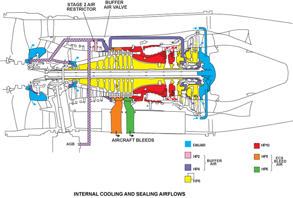 Air bleeds from different stages of the HP compressor to keep the internal engine temperature satisfactory. Some of this air goes through external tubes to the bearing chambers and the accessory gearbox. A buffer air valve, which is open at low engine power, controls one source of air. Parts of the engine which are at different pressures are isolated from each other by labyrinth seals. Air supplied to the outer surface of some of these seals prevents or controls the internal leakage of oil.