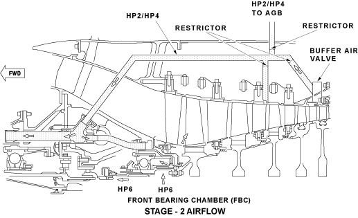 Air bleeds from the compressor case at the variable stator vane, second stage (VSV2) position. It is continuously supplied to the FBC through a tube. The same source of stage 2 air also goes to the AGB through a different tube. The air tubes which go to the FBC and the AGB connect to the stage 4 tube from the buffer air valve. The function of the stage 2 air is the same as that of the stage 4 air which goes to the FBC and the AGB.