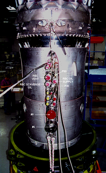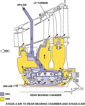 Stage 4 air also bleeds from the compressor case at four different locations to seal the rear bearing chamber. This air comes continuously through external tubes which go through the bearing chamber support struts. The air goes to the outer side of the labyrinth seals to prevent oil leakage. Some of the air mixes with the oil to cause an air/oil mist in the bearing chamber. There is also a controlled leakage of some stage 4 air through labyrinth seals to mix with stage 6 air. Used stage 4 air goes overboard through the breather.