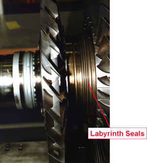 At the rear of the HP compressor drum, the stage 6 air flows through the flange to the turbines. It keeps the rear face of the HP turbine stage 2 disk cool. Some stage 6 air flows aft along the LP turbine shaft into the front LP turbine space. The air also seals the edge of the LP turbine disks and bleeds from between the blade roots. This prevents a flow of exhaust gases in to the internal parts of the engine. The stage 6 air also pressurizes the intershaft seal of the rear bearing chamber.