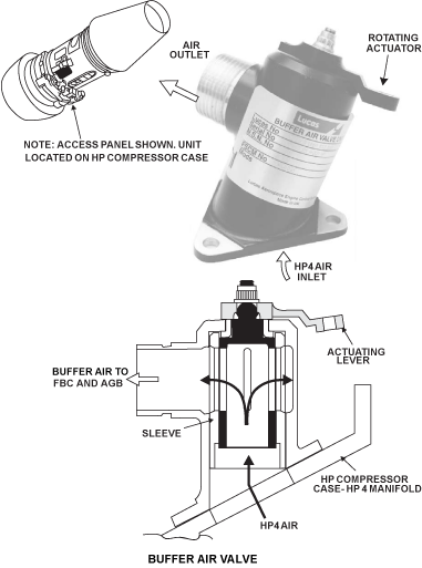 When the buffer air valve is open, stage 4 air goes to the FBC and the AGB. An air tube which attaches to the valve connects to pieces (that have the shape of a T) on the compressor case. Other tubes connect to the these pieces to supply the stage 4 air to the FBC and the AGB. The VSV actuator controls the operation of the buffer air valve directly.